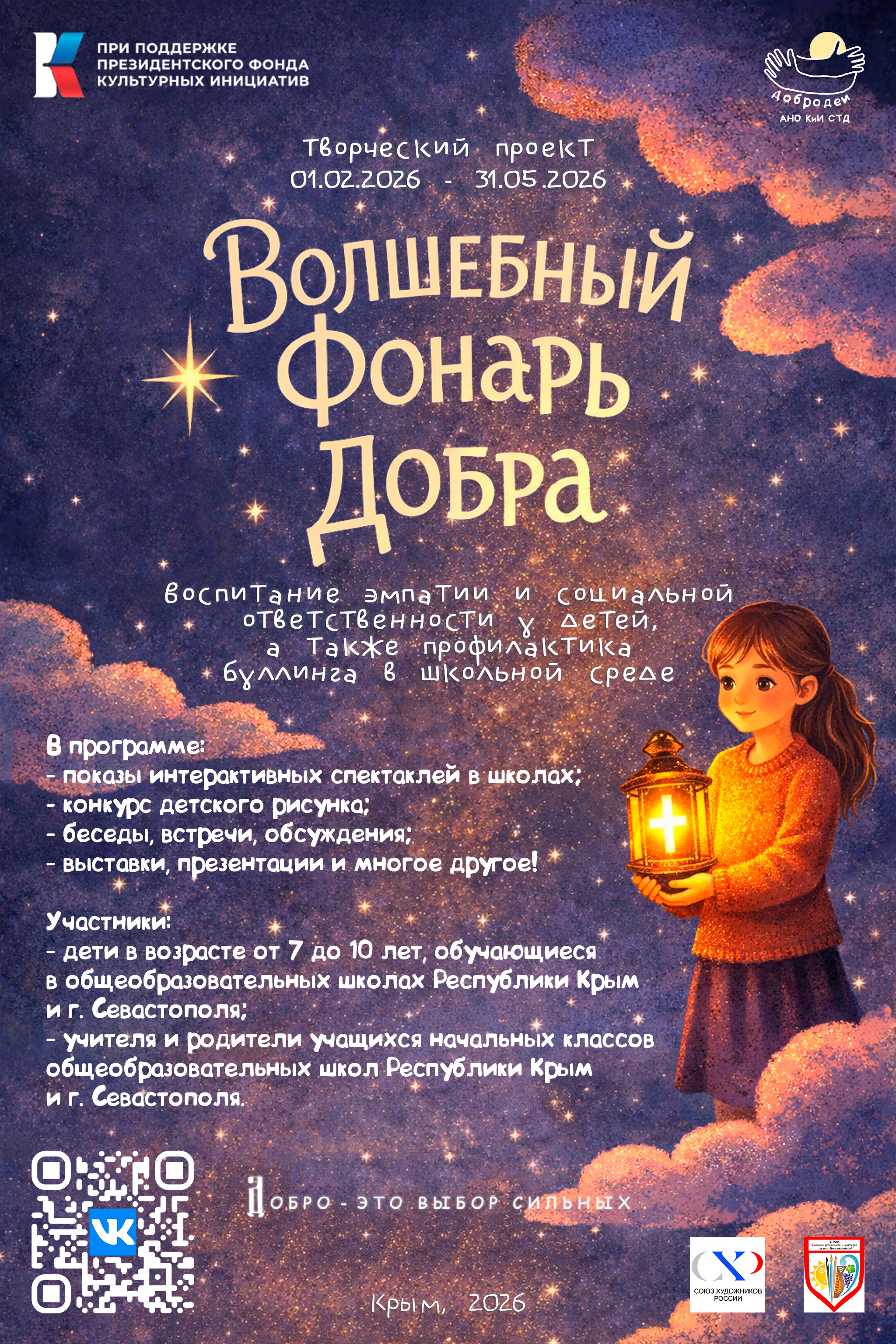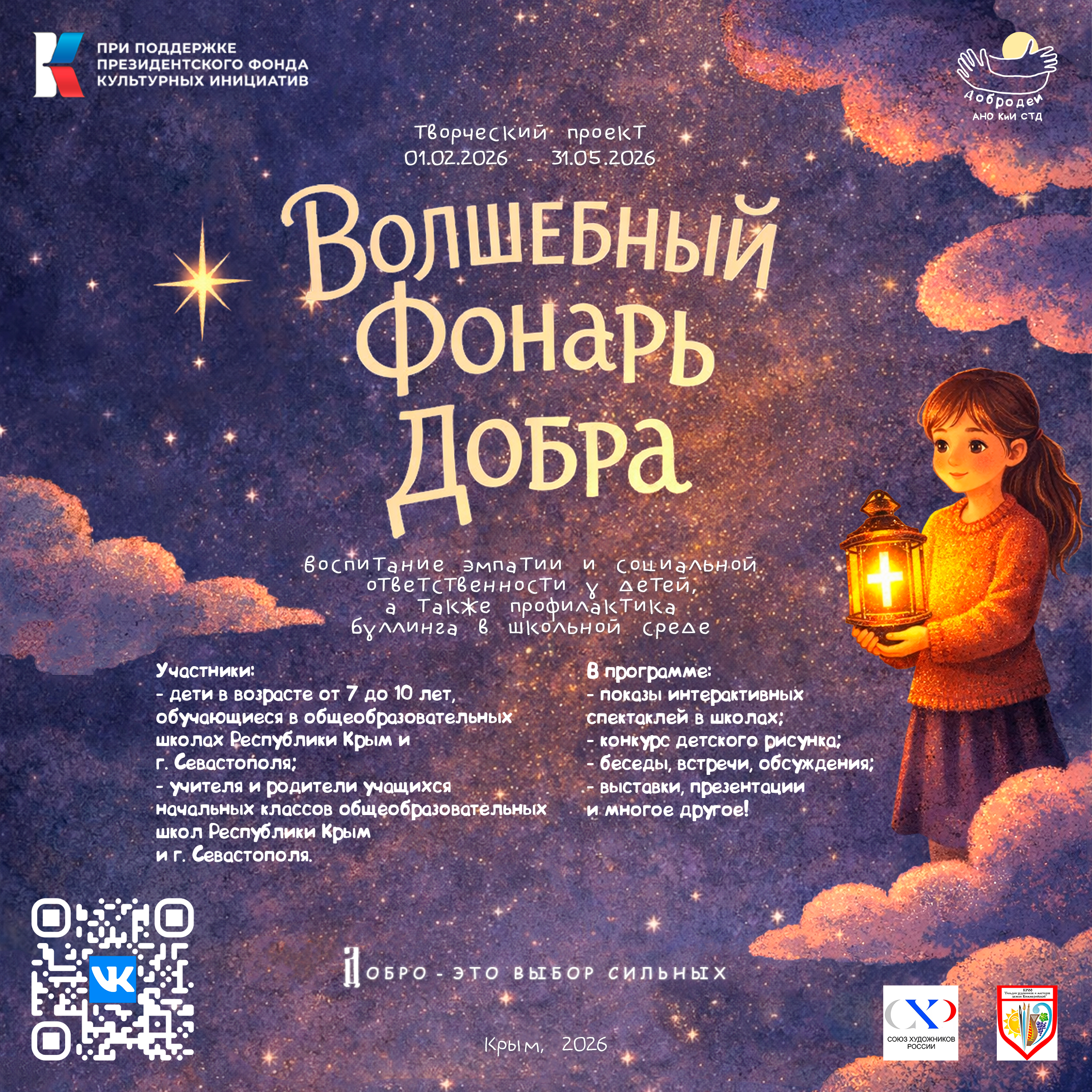 В феврале на территории Республики Крым и города Севастополь стартует уникальный социально-театральный проект «Волшебный фонарь добра» - интерактивное путешествие в мир эмпатии и взаимопомощи для детей 7-10 лет, их родителей и педагогов. Проект реализуется при поддержке Президентского фонда культурных инициатив и направлен на популяризацию традиционных духовно-нравственных ценностей - доброты, милосердия и приоритета духовного над материальным. Творческим руководителем проекта выступает деятель культуры и искусства Петросян Сергей Николаевич, куратором – заслуженный работник культуры Республики Крым Чеканова Вера Александровна.